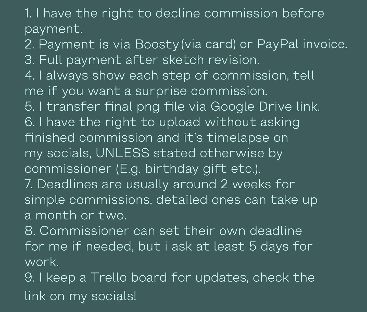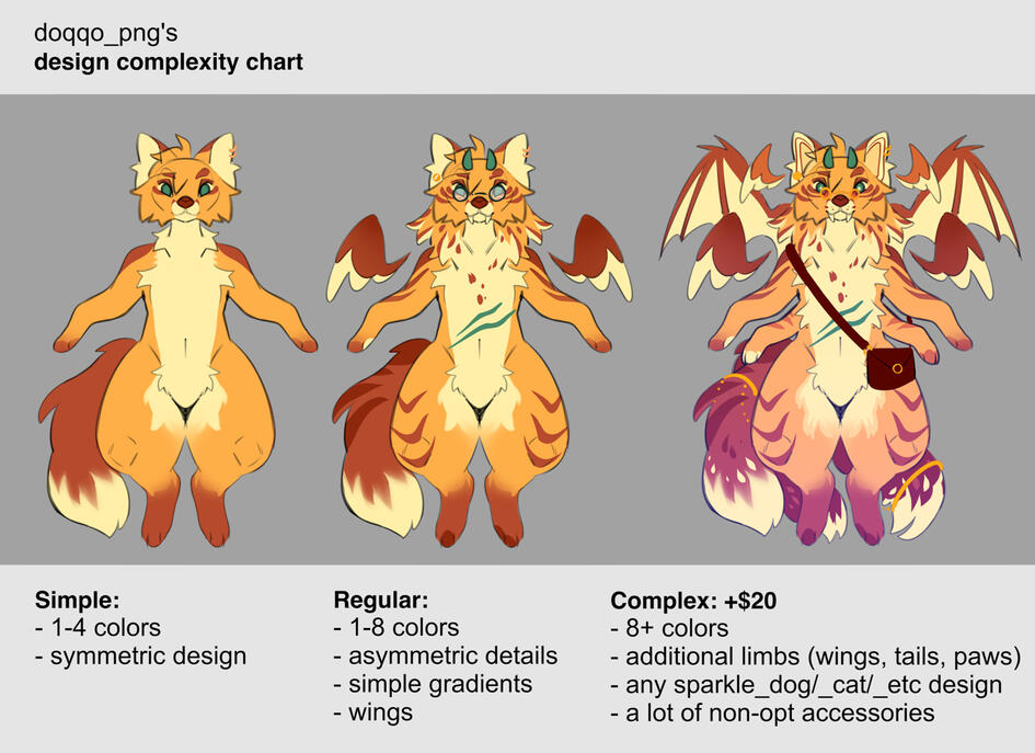 If your character design is complex, I'll add $20 to total commission price. Ask if you're unsure on your design!